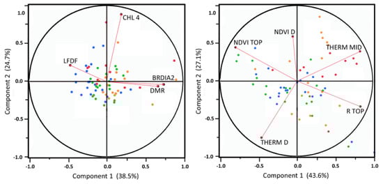 The four spectral traits identified as significantly different between treatment group by the two-way ANOVA were further analyzed with PCA, but the principal components did not capture a significant amount of variance. Subsequently, through an iterative process, various combinations of all available spectral traits were submitted to PCA. Although many results were similarly significant, a group of five traits was selected, which resulted in a highly coherent multivariate data structure that was well captured by the reduced dimensionality of PCA. Three of the traits used in the final spectral PCA were identified in the ANOVA (R TOP, NDVI TOP, THERM Δ), and two were added (NDVI Δ and THERM MID). The first two principal components captured 71% of the total crown spectral variance for those five traits. All five traits were well separated in the PCA space, indicating distinct individual contributions to the data structure. Spectral trait loading on the first four principal components are presented in Figure 4.