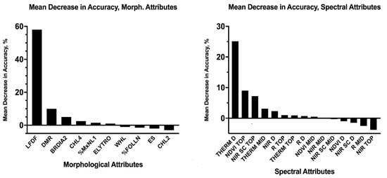 Mean decrease accuracy (MDA) for morphological (left) and spectral (right) traits using random forest. Acronyms as in Appendix B, except “D” replaces “Δ“ here.