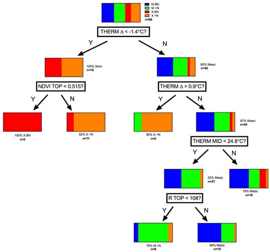 Trees with differing water availability (M and X) were successfully sorted, generating a pure X tree branch of the CTM with THERM Δ < −1.4 °C, and with THERM Δ > −1.4 °C selecting a group of trees that was 80% mesic. The pure X branch was further separated into X BN with no error by NDVI top < 0.515 (lower upper crown productivity), and X+N with 18% error. An additional separation using THERM Δ > 0.9 °C identified X+N trees (80% correct) from a mixed mesic group (M BN and M+N, combined 87%). THERM mid < 24.8 °C and R top < 108 (included one tree that had missing R) identified a terminal tree branch of 78% M+N, but all other classification tree branches were termini of mixed M trees (M BN, M+N). Xeric trees could be separated into X BN and X+N with NDVI top, THERM mid, and R top.