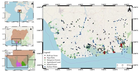 We carried out three field surveys for eight months across the Niger Delta: September 2016–January 2017 and June–August 2017. We adopted a multiclass method consisting of 6 broad vegetation classes, chosen from our knowledge of the region during fieldwork and the literature (Figure 2, Table 1). These classes were chosen in order to focus on mangrove and Nipa Palm. The other classes gave a general overview of other land cover types in the region.