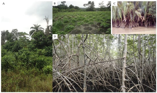 Land cover classes used in land cover classification. (A) Terra firma Forest; (B) agricultural land; (C) Nipa Palm; (D) mangrove forest.