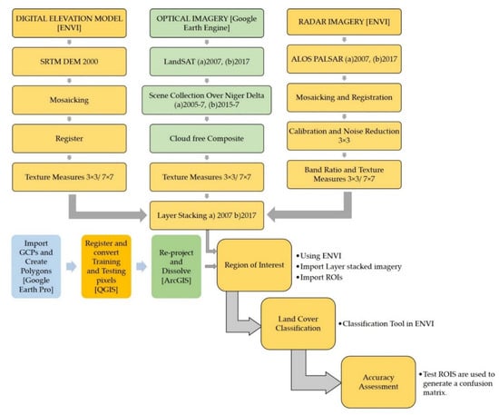 All spatial analyses were undertaken within ENVI version 5.1 [], QGIS [], Google Earth Engine (GEE) [], Google Earth Pro (GEP) [] and ArcGIS []. Three datasets were used for LC classification: SRTM DEM, ALOS PALSAR and Landsat 7 ETM+ (Figure 3). We imported ground control points (GCPs) into GEP to generate polygons based on information from field surveys. QGIS and ArcGIS were used to convert the polygons to shape file format, re-project and dissolve to the land cover classes. GEE was used to pre-process and download Landsat data. ENVI was used to pre-process digital elevation model and radar data, carry out classification and post classification. Details of these processes are given in the sections below.
