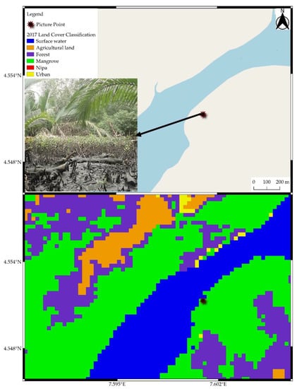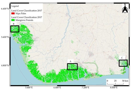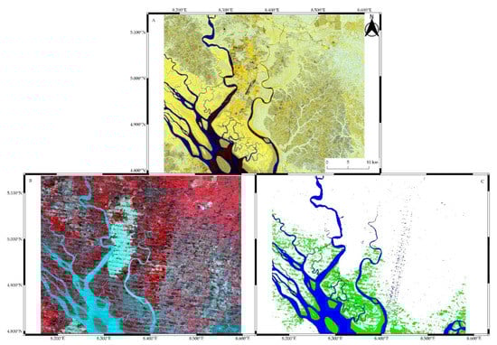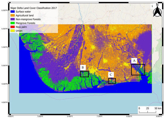 Mangrove ecosystems are intertidal regions at the land-sea, fresh-salt water interface; hence, they have characteristics of both zones. Mangrove systems also have peculiar properties, such as anaerobic conditions, salinity fluctuation, and tidal influence []. Mangrove ecosystems in the world are of great ecological, economic, and social importance [,,] because they are important carbon stores, supportive of the lives of coastal human populations who depend on fisheries. Mangrove forests also serve as a direct means of coastal protection from storm surges, tidal waves, and, over longer time scales, provide resilience to climate-change driven sea level rise. The ecosystem services provided by mangrove forests are under threat from natural and anthropogenic factors. The superimposition of mangroves with the high population density of coastal communities has resulted in rapid and increasing deforestation []. Deforestation can be because of mangrove clearance for fuelwood and fisheries, agriculture, industrial pollution, and urbanization in coastal regions. In south-east Asia, aquaculture, and agriculture are the major drivers of deforestation in mangrove forests [], while in oil producing countries, oil pollution, which results in fire largely contributes to mangrove deforestation in these regions []. Mapping mangrove forest cover across space and time can help provide information on the progress of restoration programs and detect areas of high mangrove deterioration, enabling conservation targeting, and policy implementation [].