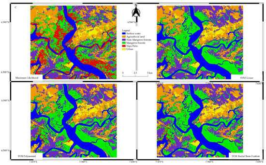 Overall accuracies from the SVM classifications for 2017 (93%) was greater than the ML method (77%). Using ML method, classification based on Landsat bands (66.8%) performed better than SAR bands (44.4%) (Table 3). Accuracy improved using a combination of Landsat and SAR bands (67.4%). Inclusion of texture measures also improved LC classification with 3 × 3 window size (77%) performing slightly better than the 7 × 7 (76.9%). Using a combination of SRTM DEM, SAR, Landsat and texture measures using 3 × 3, the overall accuracy (92–93%) did not differ amongst the kernel types tested in the SVM method (Table 3). Surface water; urban regions and agricultural lands were easily detected with PA above 90% for all SVM classifiers (Table 3, Table A1 and Table A2). The mangrove class had the lowest producer’s accuracy (65%) in the ML, but fortunately had much better accuracies (>90%) when using the SVM methods (Table 3). We also discovered that while the highest producer’s accuracy (100%) on the Nipa Palm invasive species was in the ML method, it also had a very low user’s accuracy (5%) (Table 3), with further investigation showing this was due to overestimation (Figure 4). The accuracy of Nipa Palm classification was low using all other methods, with even the best SVM method (RBF) achieving a User’s and Producer’s Accuracy of 32% and 30% respectively. However, as these were relatively balanced, we hope that the area estimate of Nipa Palm from the classification remains reasonably accurate, and certainly these low accuracies will feed into the confidence interval estimates so useful ranges of area are still available from the analysis (See Table 6).
