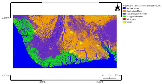 The development of a spatiotemporal map of mangrove cover for Nigeria could be valuable as it would form a baseline for mangrove conservation and restoration. Mangrove extent in the Niger Delta has been estimated by James et al. (2007) and Fatoyinbo and Simard (2013), both using an unsupervised classification ISODATA method to estimate mangrove area from Landsat Enhanced Thematic Mapper Plus (ETM+) [,]. These studies show the ability of remote sensing options in estimating mangrove area without the need for training data. However, the use of ground truth data and fused radar/optical data has not been explored in the estimation and change detection of coastal vegetation in the Niger Delta.