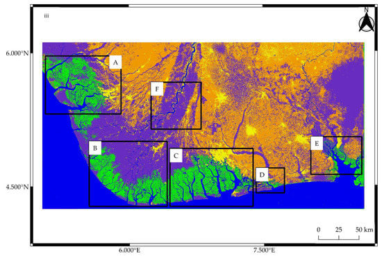 2007 (i) and 2017 (ii) thematic map derived from the classification of layer stacked SRTM DEM, ALOS PALSAR, and Landsat 7 of the Niger Delta using SVM with Radial Basis Function Kernel. Inset (iii) shows the inland extent of mangrove forests from the 2017 classification in (A) western Niger Delta; (B) central Niger Delta; (C) eastern Niger Delta; (D) Imo River estuary; (E) Calabar estuary; and (F) the River Niger Basin bifurcation and the spread of surface water proximity to rain forests and agricultural land surrounding urban settlements.