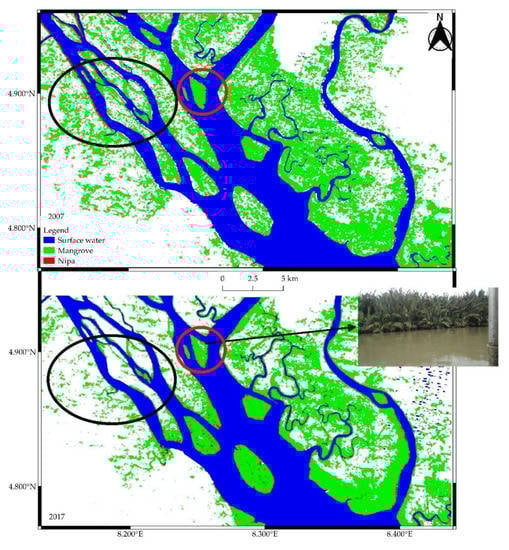 A further identified source of the degradation of Nigeria’s mangroves is the alien invasive mangrove palm, Nypa fruticans, a mangrove palm commonly known as the Nipa Palm, native to the Indian Ocean coast. Non-native species are known to proliferate in damaged ecosystems, and can lead to a change in community structure and biodiversity by altering the function of the ecosystem []. Nipa Palm was introduced in the Calabar estuary of Nigeria, to the east of the Niger Delta, in 1906 to serve as a plantation for beautification and beach erosion control []. However, Nipa Palm spreads rapidly through its water-borne seeds, and has proliferated rapidly along Nigeria’s coast. This spread has been assessed by poor management of plantations, as well as actions that degrade mangroves, letting the Nipa Palm in, including unsustainable logging activities, dredging, and oil pollution [,]. Nipa Palm spread is further compounded by the lack of use of this palm as a resource, as it is in Asia and Oceania where its fruit is eaten and used to produce juice, and palm fronds used for roof construction []. Therefore, anecdotal studies suggest Nipa Palm is gradually replacing mangrove forests in the Niger Delta, especially in areas of high exploitation []. Various attempts have been made to use Nipa Palm’s potential products, which include its sap (which is sugar rich), its tannins, its potential for bioenergy products, and its palm leaves as a building material [,,]. However, the location of the Nipa Palm along the tidal channels places it at an unfavorable location for transportation of the resource generated. The United Nations published a report in 2007 on possible control measures of Nipa Palm infestation in Nigeria []. There has also been a proposal for the utilization of Nipa Palm as a renewable source of energy []. Cultural management of Nipa Palm spread is undertaken by the removal of Nipa Palm seedlings in some parts of the Niger Delta, but there are no reports of a large-scale management plan of Nipa Palm invasion in the Niger Delta. Monitoring the extent of native species and the spread of invasive species can provide the key to controlling alien species and managing the conservation of the native species []. Therefore, monitoring vegetation over space and time is essential for successful management of Nipa Palm, as well as for other threats to mangroves forests in the Niger Delta.