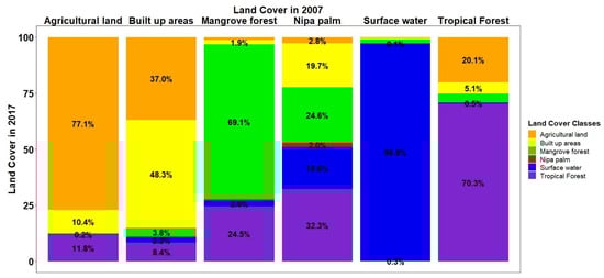 LC classification accuracy (%) of 2007 and 2017 for the classification types showing individual accuracies of the land cover classes (see Section 2.5).
