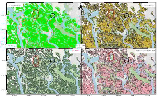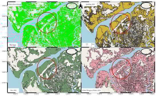 Mangrove mapping has improved as suitable satellite data and analysis tools have proliferated; however, the reliability of these maps is dependent on validation. Fieldwork in mangroves is always difficult, as their tidal nature and obstructive root systems make it difficult to access areas, measure trees, or set up plots []. The first attempt to estimate global mangrove area was done by Spalding et al. (1997), estimating about 181,000 km2 in 1997 []. They estimated mangrove area using a combination of regional maps and ground-truth data. Giri et al., (2011) estimated the global mangrove area in 2000 as 137,760 km2 using about 1000 Landsat scenes, ground truth data, regional maps and a combined supervised (driven by ground data) and unsupervised (driven by clusters in the remote sensing layers) classification techniques []. The Global Mangrove Watch has reported a new 2010 baseline for global mangrove area of 137,760 km2 using a combination of Advanced Land Observatory Satellite Phased Array L-band Synthetic Aperture Radar (ALOS PALSAR), Landsat data and Extremely Randomized Tree classifiers []. They reported an accuracy of 94% against some ground control sites globally, although this could vary on regional basis as there was no site in West Africa.