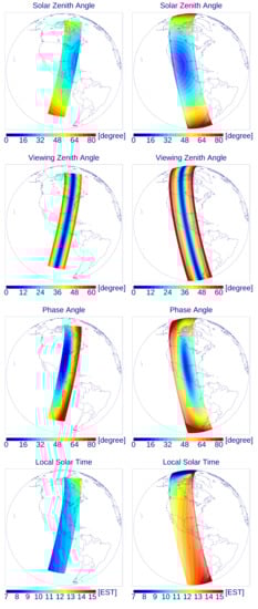 Figure 1 shows SZA, VZA, the phase angle, and local solar times (LST) of the GOME-2B and TROPOMI observations over single orbits on 28 June 2018. The inclination angles (near 98.7) and nodes of the host satellites impact the local overpass times along their orbits. With GOME-2B in a descending orbit (daylight on descending node), LSTs are generally later than the 09:30 equator crossing time in the northern hemisphere (NH); for TROPOMI in its ascending node, LSTs are generally earlier than its 13:30 equator crossing time in the NH. The reverse situation occurs in the southern hemisphere.