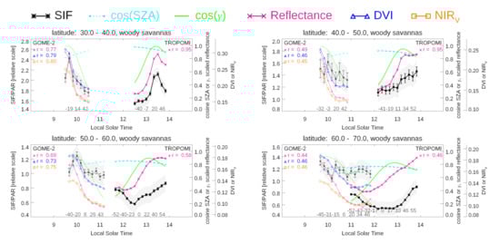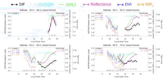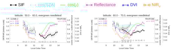 We calculated the zonal means of the native GOME-2 or TROPOMI SIF retrievals and related parameters for 10 latitude, ten minute bins, for different plant functional types (PFTs). We did this for the month of June 2018 around the peak of the northern hemisphere growing season. To compute the zonal averages, we first averaged the data monthly into  latitude  longitude grid boxes then aggregated the gridded data into the appropriate latitude, time, and PFT bins. Only data with cloud fractions <0.1 were used. We repeated our analysis using all data with cloud fractions <0.3 and did not find qualitatively different results although correlations between SIF/PAR and reflectances were somewhat lower on average. At the highest high northern latitudes examined here in summer months (60–70), GOME-2B and TROPOMI provided nearly continuous temporal coverage from 09:00 to 13:00. We computed the percentages of PFTs in each of our 0.5 gridboxes using 2017 land cover types on the climate modeling grid (CMG, 0.05 grid) derived from MODIS observations (MCD12C1 product) []. Only gridboxes that have a majority PFT with coverage >50% were used in our analyses.