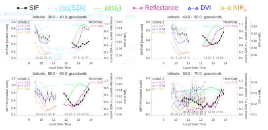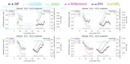 Figure 2, Figure 3, Figure 4, Figure 5, Figure 6 and Figure 7 show SIF normalized by incoming PAR (plotted as SIF/cos(SZA) and denoted as SIF/PAR), , and satellite and solar angle information as a function of LST (or alternatively VZA) for late morning through early afternoon averaged over gridboxes dominated by different plant functional types for different latitude bins in June 2018. DVI and NIR are shown only for GOME-2 as  was not available in the TROPOMI SIF data set. The  standard error of the mean, i.e., standard deviation of all gridbox values () divided by  for each binned zonal average is shown by the vertical error bar and represents an uncertainty due to random errors. A conservative empirical estimate of the systematic error (0.1 mW/m/nm/sr for SIF/PAR) is shown with the shading. Correlations between the binned SIF/PAR averages and the corresponding  and available reflectance-based indices are also provided, separately for GOME-2 and TROPOMI. Correlations will similarly be computed using SCOPE 1D simulations below and then may be compared with those from satellite observations. Individual satellite SIF observations are dominated by retrieval noise and this makes it difficult to interpret results at the pixel level; this is why we have conducted our analysis on zonal averages. The correlations are computed for the binned averages and contain only a limited number of points per PFT and latitude range. We note that even though we average hundreds of individual pixels per bin, one or two noisy or questionable binned data points may substantially degrade the correlations.