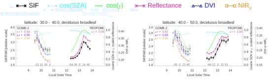 Here, we examine the sun-sensor geometry dependence of far-red SIF, near infrared (NIR) reflectance, and two reflectance-based indices that have been proposed as proxies for  with large swath satellite sensors: the Global Ozone Monitoring Experiment 2 (GOME-2) and the TROPOspheric Monitoring Instrument (TROPOMI). We consider the range of local solar times (and thus solar zenith angles) observed systematically across the large swaths of GOME-2 and TROPOMI. Although the host satellites of GOME-2 and TROPOMI have equator crossing times that differ by hours, their orbital attributes allow SIF retrievals from these sensors to be directly compared at the same local overpass times at high latitudes in the northern hemisphere during summer, sometimes with similar viewing geometry. Using a one dimensional (1D) canopy radiative transfer model, we examine the geometry dependences of SIF, its basic components in Equation (1), as well as NIR reflectance and related indices including systematic satellite cross-track variations.