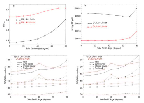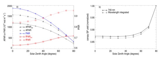 Both modeling results and observations suggest that the magnitude and variation of far-red canopy SIF are largely driven by the amount of absorbed photosynthetically-active radiation for SIF (APAR) (e.g., [,,,,,]). An ongoing challenge for SIF interpretation is disentangling the information about both vegetation structure and biochemistry expressed in spectral optical properties, from the physiological signal in  that distinguishes SIF from traditional reflectance measurements (e.g., [,,,]). For example, Wittenberghe et al. [] stressed the importance of quantifying canopy structural parameters such as leaf area index and angular distribution with reflectance data for detailed analysis of remotely-sensed SIF. In addition, it is important to account for solar-satellite geometry that impacts illumination and e in the direction of the observer (e.g., [,,,,,,,,,,,,,,,]). Vertical and horizontal inhomogeneity of vegetation canopies also affect canopy-level SIF including its angular distribution [,,].