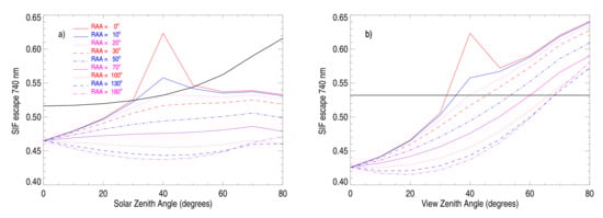 Figure 10a shows for the same setup TOC SIF simulations as a function of SZA for VZA = 40 for the same range of RAA as in Figure 9. The TOC SIF variation with SZA is dominated by that of APAR. Figure 10b similarly shows TOC SIF as a function of VZA at SZA = 40 that is related to the escape factor.