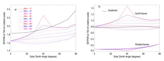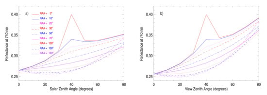 Figure 12a,b similarly shows SCOPE simulated TOC reflectance at 740 nm as a function of SZA and VZA as in Figure 10. This shows that SIF/PAR and 740 nm reflectance have similar geometrical dependence, both with a depicted hot spot.