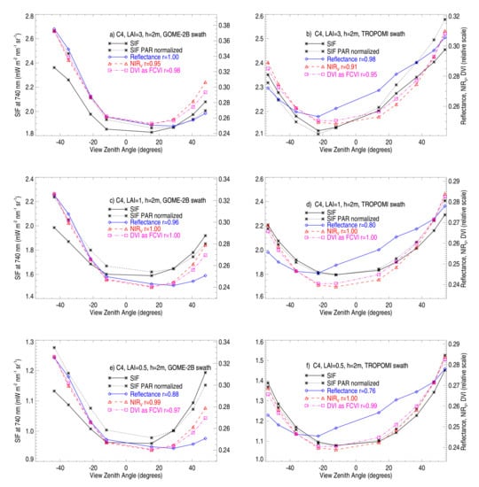 Figure 14 shows SCOPE simulations of TOC SIF, SIF/PAR, , NIR, and DVI as a function of VZA for SZAs and phase angles corresponding to typical swath sun–satellite geometries for GOME-2 and TROPOMI; VZAs with negative values correspond to the west sides of the satellite swaths. SCOPE calculations computed at 10 SZAs, 10 VZAs, and 19 RAAs were interpolated to the average geometries shown in Figure 3 for grasslands in the 30–40 latitude band corresponding to June 2018. TOC SIF is shown with and without normalization for incoming PAR. The PAR normalization produces cross-track SIF variations that are more similar to that of reflectance and reflectance-based indices for GOME-2, but overall PAR normalization does not much change the cross-track SIF variation. Similar cross-track behavior of SIF/PAR and reflectance-based indices are shown for the C4 case for geometries corresponding to the 50–60 latitude band in Figure A4 and for the deeper canopy C3 LAI = 5 and LAI = 1 cases in Figure A5.