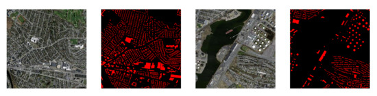 The Massachusetts dataset consists of 151 aerial RGB images and corresponding semantic labels. This dataset is collected from the Boston area and covers roughly 340 . The size of each image is and the resolution is . The whole dataset is randomly divided into a training set of 141 images and a testing set of 10 images. The types of buildings within this dataset are diverse, including individual houses, garages from urban and suburban areas, etc. Figure 4 exhibits two examples with their ground truth.