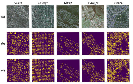 Building extraction results of our GMEDN model. Five images are randomly selected from the Inria dataset. They belong to Austin, Chicago, Kitsap, Tyrol_w, and Vienna cities respectively. (a) Original image, (b) Ground truth, (c) Prediction.