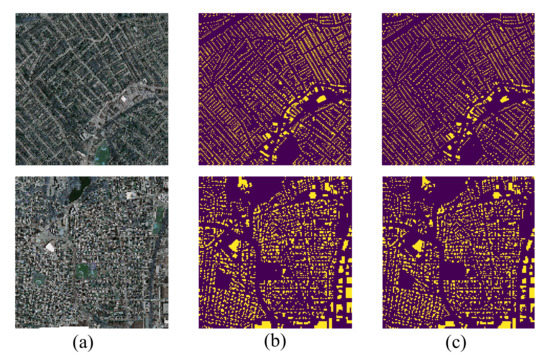 Building extraction results of our GMEDN model. Two images are randomly selected from the Massachusetts dataset. (a) Original image, (b) Ground truth, (c) Prediction.