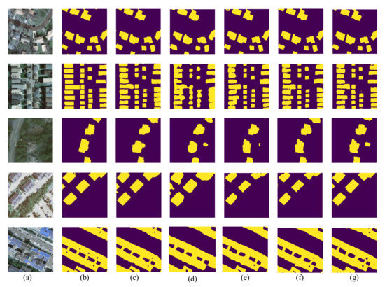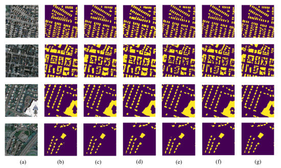 Apart from the numerical results, we also exhibit the building extraction results visually. Due to the space limitations, rather than showing the whole images’ results, the extraction results of the image patches with the size of are displayed. We select some image patches from the Inria dataset and the Massachusetts dataset randomly, and their building extraction masks are shown in Figure 7 and Figure 8.
