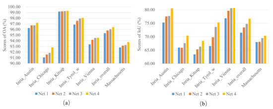 The results of these networks counted on two datasets are shown in Figure 9, where Figure 9a shows the OA scores and Figure 9b displays the IoU scores. The first six groups of bars are the results of the Inria dataset and the last group of bars is the results of the Massachusetts dataset. From the observation of Figure 9, we can find the performance of different networks is proportional to the numbers of sub-models. In detail, the behavior of Net1 is the weakest among all compared networks since it only consists of a basic encoder-decoder network. After adding the non-local block, the performance of Net 2 is stronger than that of Net 1, which proves the usefulness of the non-local block. Due to the fusion scheme, Net 3 outperforms the Net 1 and Net 2 which confirms the contribution of the connection block. Integrating all sub-models, Net 4 achieves the best performance. Furthermore, the performance gap between Net 4 and other networks is distinct. The results discussed above demonstrate that each sub-model can make a positive contribution to our GMEDN model.