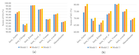 To get the segmentation results, three models are trained with the experimental settings discussed in Section 4.2. The OA and IoU scores counted on the Inria and Massachusetts datasets are exhibited in Figure 10, in which the first six sets of bars correspond to the Inria dataset while the last set of bars corresponds to the Massachusetts dataset. It is easy to find that the performance differences between the three models are small. Taking the Vienna city within the Inria dataset as an example, three models’ OA scores are , , and , while their IoU scores are , , and . This indicates that our GMEDN is not sensitive to the non-local block.