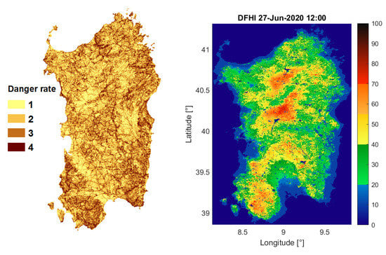 In order to assess the performance of the DFHI in predicting the fire hazard, daily DFHI values were compared to the latest official wildfire records in the area of interest, which at the time of writing date back to the year 2017. DFHI maps were generated for the entire fire season of 2017, conventionally assumed to start the first of June and to end on 31 August. The area of interest, which consists of the region of Sardinia, is particularly suitable for our purposes, since it is well known that the most damaging wildfires occur in days of strong Mistral winds [65].