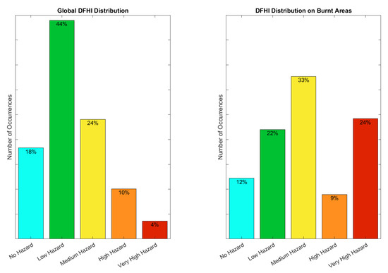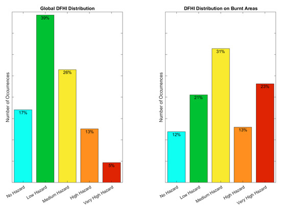 Finally, the global DFHI distribution and the DFHI distribution restricted to the burnt areas were represented using side-by-side bar plots. This allows us to compare the global distribution of the DFHI with its distribution over burnt areas at a glance, and to assess its performance and to quickly identify any bias, either towards higher or lower hazard classes. This process was carried out firstly using the old DFHI algorithm that did not correct the temperature using the evapotranspiration, and the results are shown in Figure 3. Secondly, the process was repeated using the latest version of the DFHI algorithm discussed in this article, whose results are shown in Figure 4. Note that the entire terrain of the region of Sardinia is included in this analysis, without excluding a priori land cover types that are not usually a target for wildfires, such as urban areas or sandy areas.