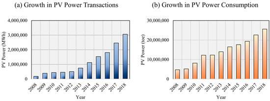 Meteorological satellite images possess suitable technical specifications and characteristics for PV forecasts and solar irradiance estimation, especially for shorter forecast time horizons, ranging from 30 min to 6 h [5,6,7]. Short-term PV forecasts are significant for PV system operators, market participants, and the authorities regulating the electricity market. In general, electric power markets hold day-ahead and intra-day market transactions that follow a price bidding system [8,9]. For PV system operators, PV forecasts are important to reduce uncertainties with power generation, ensure grid stability, reduce the number of units in “hot standby” and lower operation costs [8], implement effective and timely ramping procedures [10,11], facilitate efficient power system planning [12], and economic dispatch [11,13]. For market participants, PV forecasts are required to avoid potential penalties and generate precise bids. In Korea, the PV market has experienced remarkable growth over the past decade due to considerable improvements in domestic PV technology, steady funding for PV research, implementation of government policies promoting the use of renewable energy, and the establishment of basic plans and detailed action programs [14,15,16]. As shown in Figure 1, the PV power market is continuously expanding in PV power transactions and PV power consumption. The government seeks to increase the energy contribution of solar stations to 14.1% of the nation’s total renewable energy production by 2035 and to invest in increasing the commercialization of PV technology and their global market share [15]. With regards to the Korea power exchange market, bids are received based on the power supplier’s generating capacity and conducting thorough demand forecasts for optimal pricing and scheduling. However, penalties may be imposed for deviations between predicted and produced power, implying that larger forecast errors will lead to a higher cost of energy, reinforcing the necessity of accurate and reliable PV forecasts [8,9].
