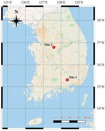 South Korea has a temperate climate with four distinct seasons. Summer months from June to August are warm and humid with monsoon wind and typhoon occurrences, whereas winter months from December to February experience occasional snowfall. The country’s average daily solar radiation is estimated to be approximately 4.01 kWh/m2, which is considered to be relatively high compared to other countries at similar latitudes like Japan. For instance, Jeonju (latitude 36° N, longitude 127° E) situated in South Jeolla Province of Korea has an annual average global horizontal irradiation (GHI) of 4.01 kWh/m2, whereas Tokyo (latitude 36° N, longitude 139° E) has an annual average GHI of 3.64 kWh/m2, indicating Korea’s relatively higher untapped solar potential [14]. Two test sites were selected for this study and are displayed in Figure 2.