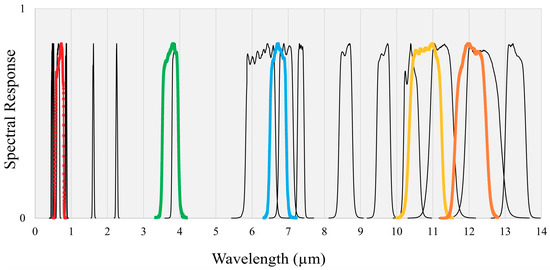 Comparison of spectral response functions (SRF) for Communications, Oceans, and Meteorological Satellite Meteorological Imager (COMS MI) and Himawari-8 Advanced Himawari Imager (H8 AHI) using spectral responsivity data supplied by the National Meteorological Satellite Center (NMSC) and Japan Aerospace Exploration Agency (JAXA). The black-colored curves represent H8 SRF and the colored curves represent COMS SRF.
