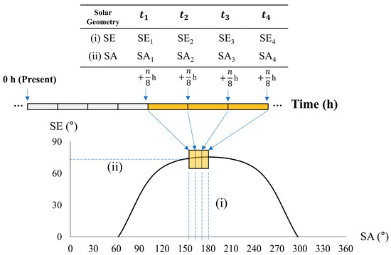 Solar elevation (SE) angle and solar azimuth (SA) angle variables are included in this study since incorporating solar geometry has shown the ability to improve the accuracy of short-term PV power forecasts [36]. Given that solar irradiance is highly dependent on the sun’s location, SE and SA were added since these variables are used to determine solar position and because they are easily accessible given prior knowledge of the target’s location [33,44]. Considering that SE and SA follow a cyclic pattern with respect to the sun’s location relative to the earth, hourly SE and SA data can be further divided into additionally shorter time intervals to represent solar geometry in finer detail or at a higher temporal resolution [36]. For this study, each hourly timestamp was divided into four SE and four SA data values. To clarify this concept, Figure 5 displays a schematic showing the division of the solar geometry variables. For an n h-ahead PV forecast being conducted at 0 h, SE and SA values are allocated to the four timestamps in the latter half of the forecast horizon highlighted in yellow in Figure 5. In this study, 2 h-ahead forecasts use solar geometry variables at 20-min interval timestamps and 1 h-ahead forecasts at 10-min interval timestamps. SE and SA variables were calculated using the pvlib library in Python [45].