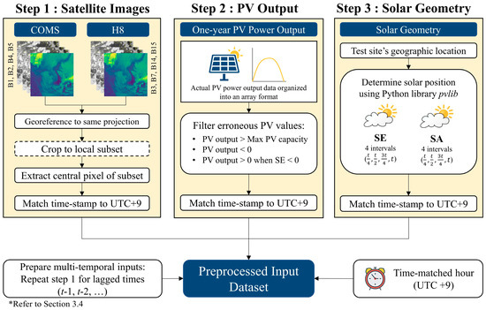 Preprocessing is imperative to integrate different input variables collectively into the PV forecast model. To avoid confusion, individual data sources outlined in Section 3 are henceforth referred to as “input variables”, while the combined set of these data sources is expressed as the “input dataset”. Data preprocessing is divided into three principal steps: satellite image preprocessing, PV power data filtering, and timestamp matching of input variables. The three preprocessing steps are organized into a flowchart, provided in Figure 6.