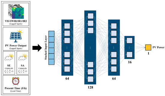 Structure of the deep neural network (DNN) model used in this study showing four hidden layers with 64, 128, 64, and 16 nodes in order of each layer, fully connected to forecast a single PV power output prediction for each hourly timestamp. The various input variables are also included in the diagram to depict the implementation of the input dataset into the input layer of the DNN.