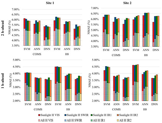 2 hour (h)- and 1 h-ahead PV forecast results in normalized mean absolute error (NMAE) (%) for each spectral band from COMS and H8 datasets using support vector machine (SVM), artificial neural network (ANN), and DNN models. Solid color bars represent the “Sunlight H” time frame, whereas the overlapping stripe color bars represent the “All H” time frame using identical NMAE scales.
