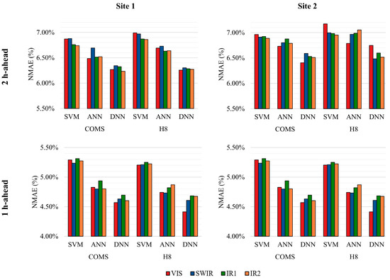 Additional trends can be found by evaluating results from each forecast model and each spectral band. First, when comparing the NMAE results by forecast model, the DNN model produced superior PV forecast accuracy as evidenced by the lowest NMAE results for both time frames and forecast horizons. The DNN model NMAE reached as low as 5.30% and 5.12% for 2 h-ahead forecasts using COMS and H8 in the “Sunlight H” time frame. The DNN model also exhibited better forecast accuracy than the ANN model, therefore indicating that deeper neural networks can be more effective in interpreting the complex nonlinearities in the input variables. On the other hand, the relatively poor forecast accuracy of the SVM model suggested the model’s difficulty with interpreting the higher complexity of the numerous input variables. Second, when comparing the NMAE results for each spectral band, the VIS band tended to yield relatively lower NMAE results for the vast majority of the test cases, especially when using the DNN model, which consistently returned the lowest NMAE results. These trends suggest that the relatively higher significance of the VIS band is consistent with the previous study [23], which revealed that the COMS VIS band was more significant for solar irradiation estimation in comparison to other COMS bands.