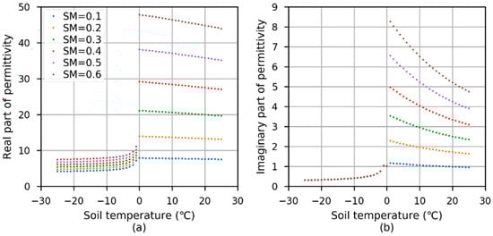The relationship of the real part (a) and imaginary part (b) of permittivity and soil temperature under different soil moisture contents. SM stands for soil moisture, while its unit is cm3/cm3. Soil texture for the simulations is: sandy percentage is 51.5 %, clay percentage is 13.5 %, while the bulk density is 1.60 g/cm3.