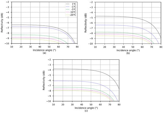 where can be calculated by the aforementioned mixed medium permittivity models. Figure 2 simulates the relationship between reflectivity and incidence angle under different temperatures. The soil texture information is the same as presented in Figure 1. The permittivities used to calculate the surface reflectivities are received from the models shown in Section 2.1. The soil moisture values used in Figure 2a–c are 0.1, 0.2, and 0.3 cm3/cm3, respectively. Over the wet area, the soil temperature positive–negative conversion can greatly change the land surface permittivity which can cause 2 dB change in reflectivity when the soil moisture is 0.3 cm3/cm3; this effect weakens as the soil moisture decrease. The incidence angle can also affect the reflectivity, especially at the high incidence angle.