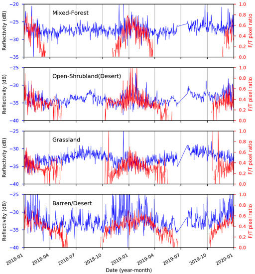 The time series of surface reflectivity versus Soil Moisture Active Passive (SMAP) provided freeze ratio area under different land cover types on Tibetan Plateau.