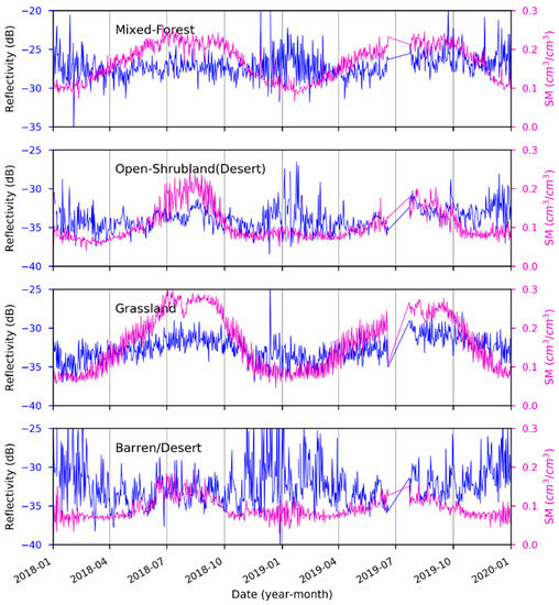 The time series of average surface reflectivity versus SMAP average soil moisture under different land cover types on Tibetan Plateau.