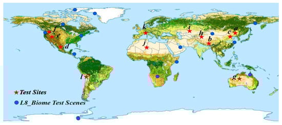 Spatial distribution of the 12 test sites and the 14 L8_Biome Landsat-8 test scenes. The background map is the 300 m Global Land Cover Map (GlobCover 2009) [39]. Noted: L8_Biome Test Scenes refers to the Landsat-8 test images selected from the Landsat 8 Cloud Cover Assessment Validation Dataset.