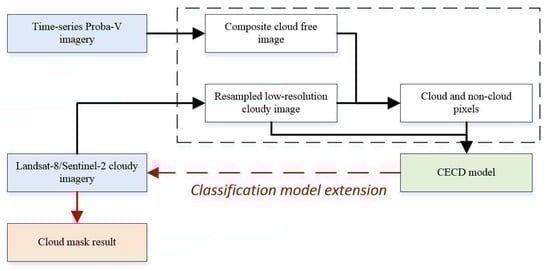 Flowchart of the classification extension-based cloud detection (CECD) method. The input datasets are shown in blue dotted boxes.