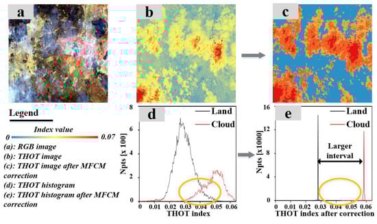 where is the probability that a pixel belongs to cluster ; m is a weighting exponent, for which a default value of 2 was used; is the corrected THOT value of pixel obtained by subtracting the gain field, ; is the total number of pixels; C is the number of clusters, which was set to 2 (cloud and non-cloud); is the prototype of the centroid for cluster ; is the mean value of the pixels within a 3 × 3 window around pixel j; and controls the neighboring effect—a default value of 0.3 was used for this. Since Yang et al. [47] conducted comprehensive tests on these parameters, and the default values of all parameters were the optimal values they derived, all the parameters in MFCM were set as the default settings. An example of the application of this method to a HOT image histogram is shown in Figure 3 below. It polarizes the image reflectance distribution of clouds and lands to generate a dual-mode histogram (Figure 3e), which results in an increase in the contrast between thin clouds and neighboring surfaces in the corrected image (Figure 3c).