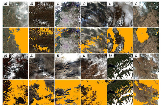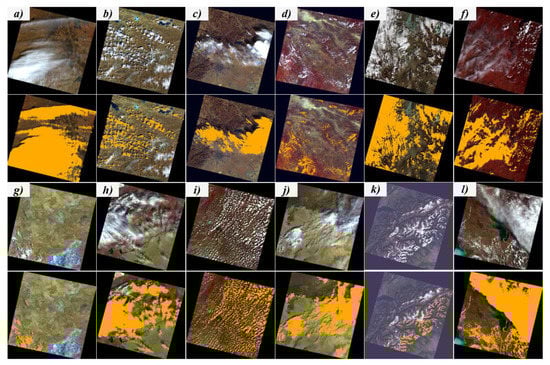 Cloud masks generated by CECD for 12 different Sentinel-2 scenes. (a–l) are the corresponding Sentinel-2 scenes from sites a to l (Table 1). The upper row is color-composited cloudy images. The lower row is the corresponding CECD cloud masks (in orange).