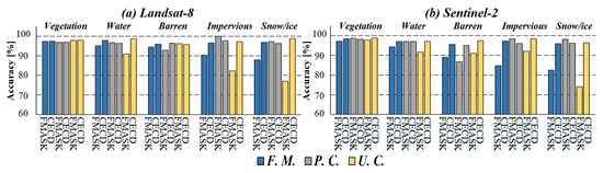 Average cloud detection accuracy obtained using FMASK and CECD for typical surface-cover types. (a) Average accuracy of the cloud detection for Landsat-8 imagery. (b) Average accuracy of the cloud detection for Sentinel-2 imagery. Noted: F. M., F-Measure; P. C., producer’s accuracy for cloud; U. C., user’s accuracy for cloud.