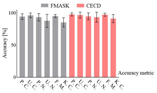 Accuracy assessment results for CECD and function of mask (FMASK) based on the application of these methods to the Landsat-8 and Sentinel-2 scenes at the 12 test sites [%].