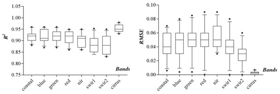 Box plots of average coefficient of determination (R2) and the root mean square error (RMSE) for measuring the consistency of 30-m Landsat-8 TOA reflectance and the corresponding 300-m resampled Landsat-8 TOA reflectance. Horizontal lines in each box plot represent the location of the 10th, 25th, 50th, 75th, 90th percentiles; the circles are the 5th and 95th percentiles.