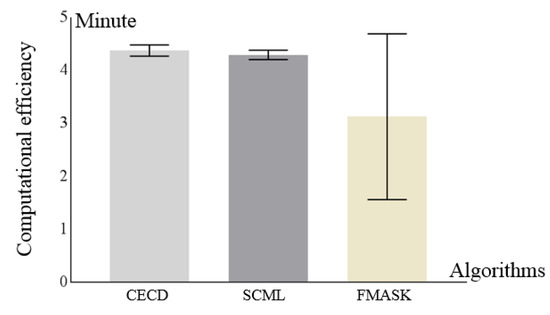 A bar graph plot of the computational efficiency of CECD, single classifier-based machine learning method (SCML), and FMASK with standard deviation error bars.