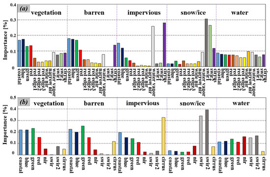 The importance of the training bands of Landsat-8 and Sentinel-2 images for different environments, as found using the RF model. (a,b) show the importance of the different input bands of Sentinel-2 and Landsat-8 imagery, respectively.
